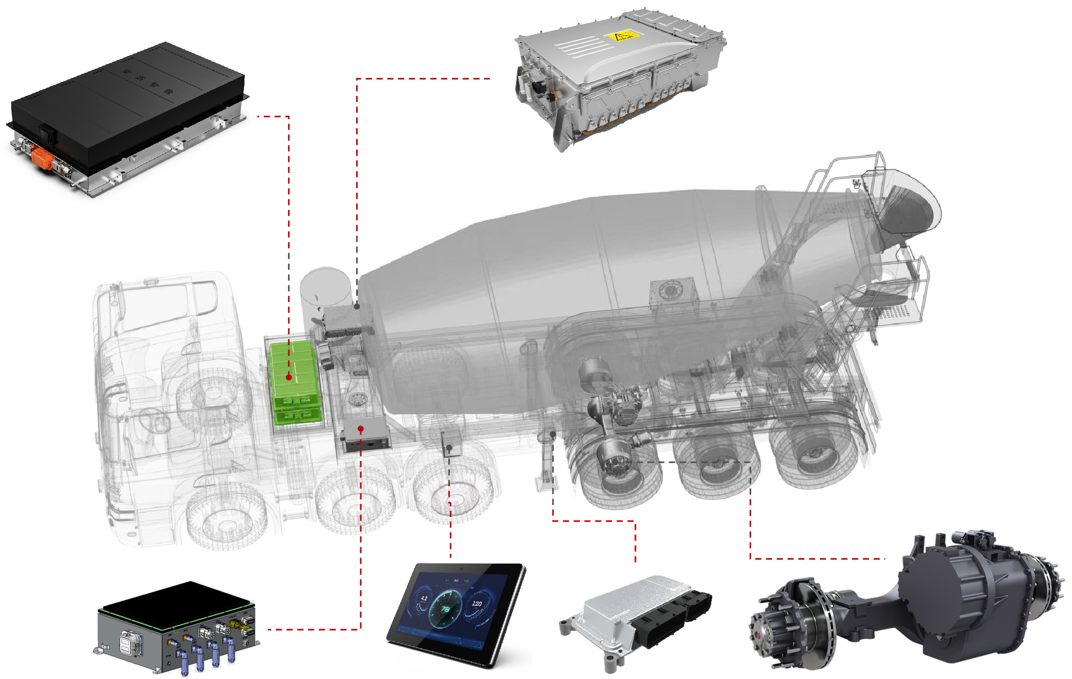 展会上,公海jcjc710智能的智电一体化解决方案引起了广泛关注。工程师团队在现场为参展观众详细介绍了混合动力牵引搅拌半挂车的系统方案。该方案基于公海jcjc710智能历经多年开发的eMagi智电平台,针对牵引搅拌半挂车进行了定向开发,涵盖以下几个方面: